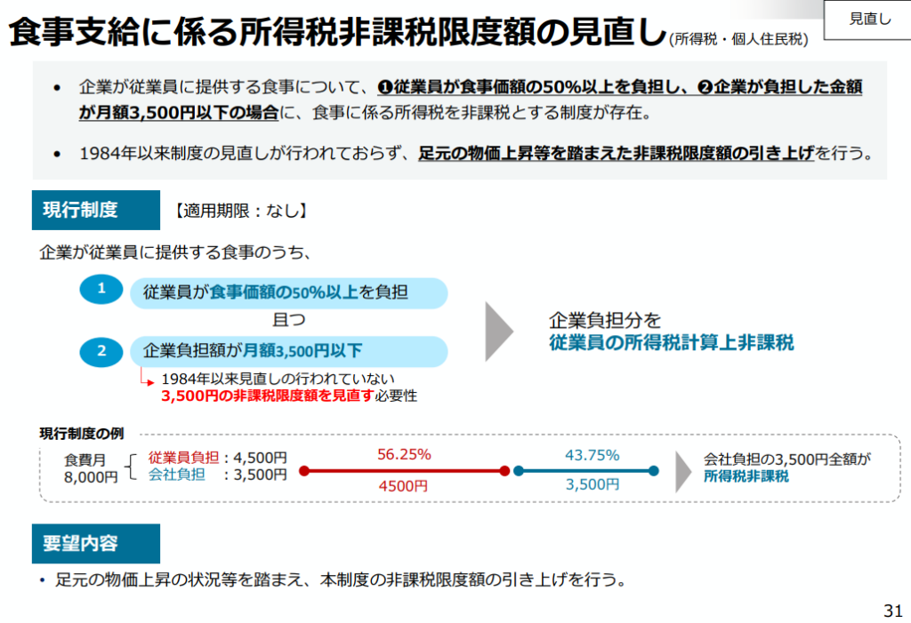 経済産業省の要望の中には、 「食事支給にかかる所得税非課税限度額の見直し」が含まれています。