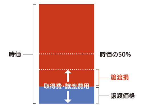 左記の図のように、譲渡価格が譲渡時の時価の1/2未満の場合には、譲渡損がなかったものとみなされます。